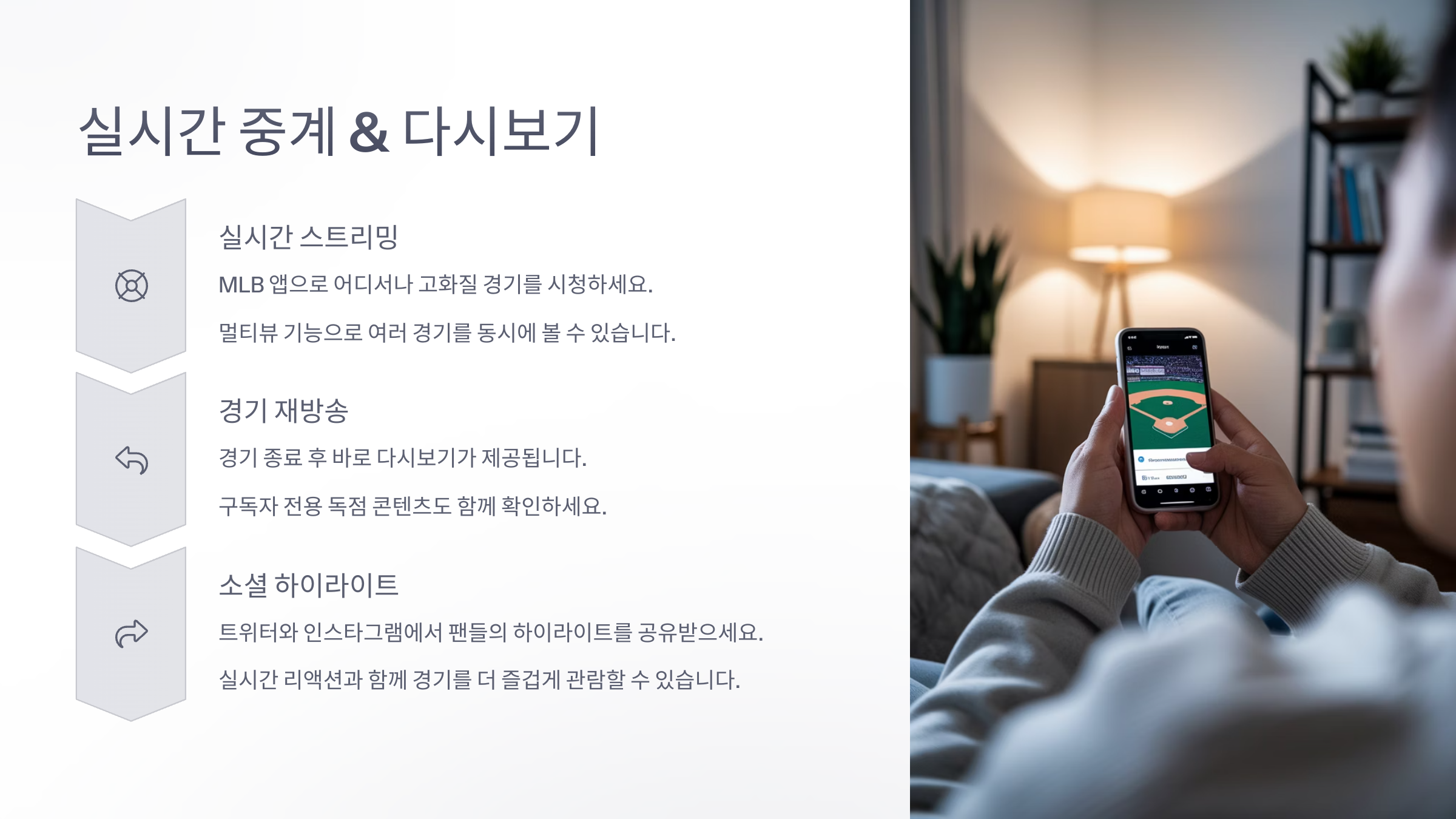 MLB.TV는 경기 전체를 고화질로 다시 볼 수 있을 뿐 아니라, 하이라이트, 이닝별 영상, 타석별 영상도 따로 제공돼요. 원하는 장면만 골라보기도 가능해서 아주 편리해요.
