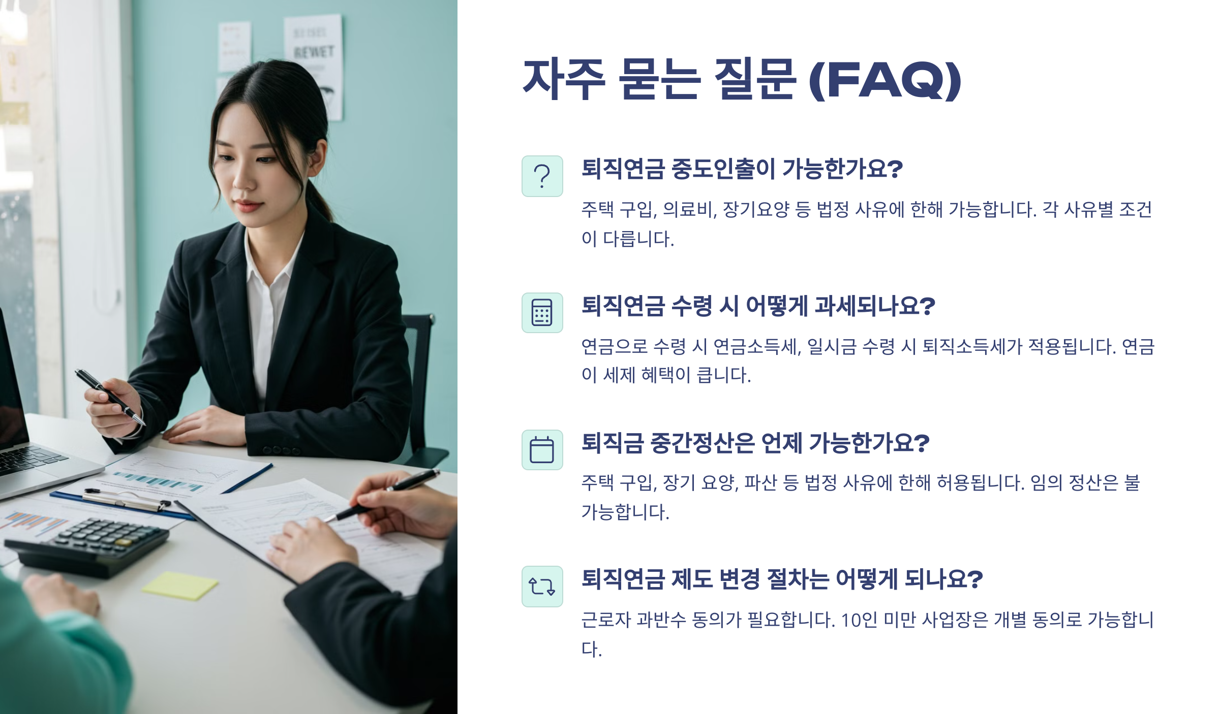 | 단기 근무 or 이직 잦음 | 퇴직금 | 간편하고 예측 가능 |