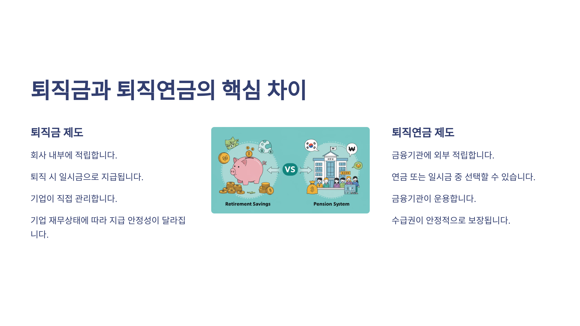 | 수령 방식 | 일시금 중심 | 연금 + 일시금 선택 가능 |