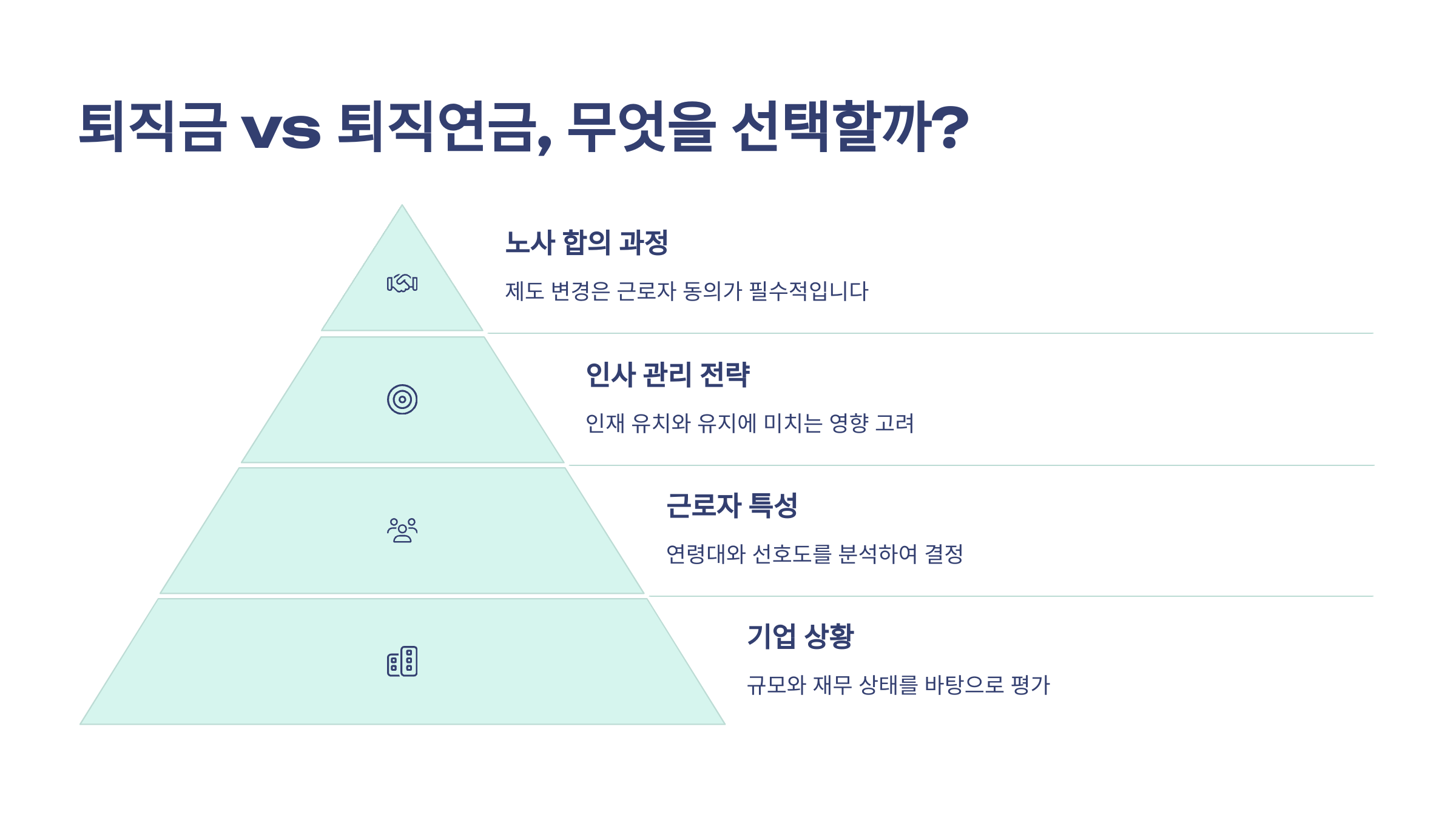 반면, 소기업에 근무하거나 회사의 재정이 불안정하다면 퇴직연금을 강하게 요구하기 어려운 경우도 있어요. 이럴 땐 퇴직금 제도가 오히려 현실적인 선택이 될 수 있어요. 단순하고 일시금 수령이 확실하기 때문이에요.