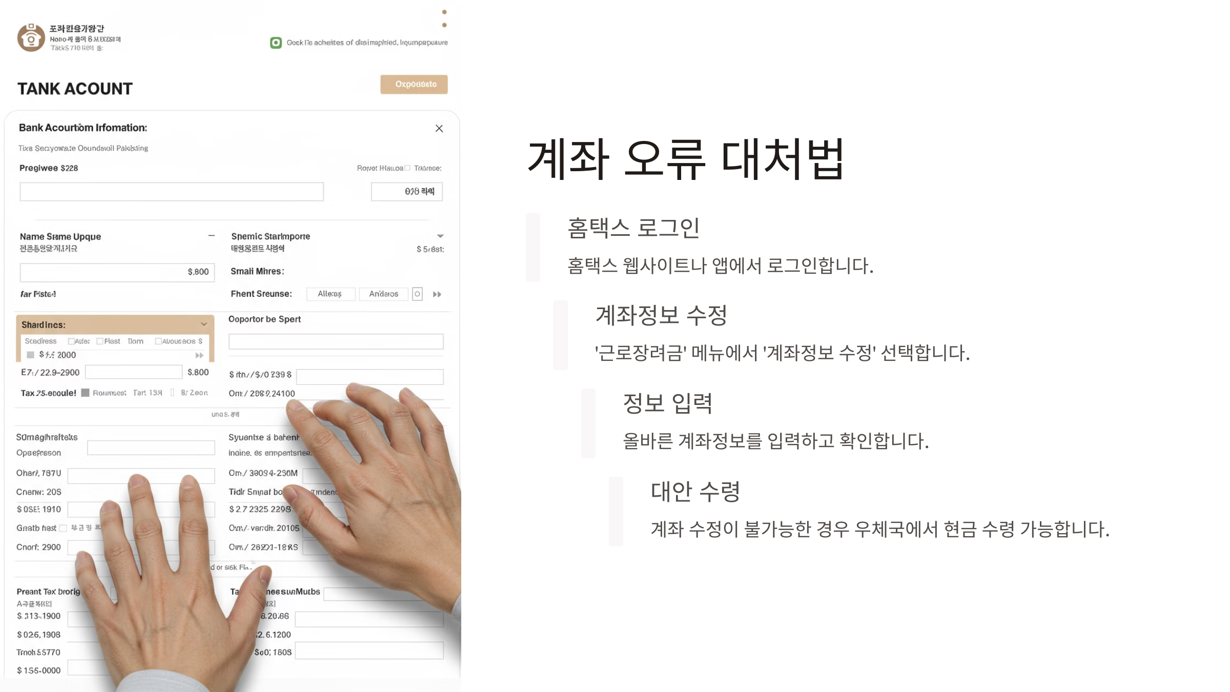 1️⃣ 계좌번호 오류 신청 시 입력한 계좌번호가 잘못됐거나, 타인 명의 계좌를 쓴 경우 입금이 실패해요. 이 경우 국세청에서 따로 문자나 유선으로 연락이 오기도 하고, [홈택스 → 계좌정보 수정] 메뉴에서 수정 가능해요.