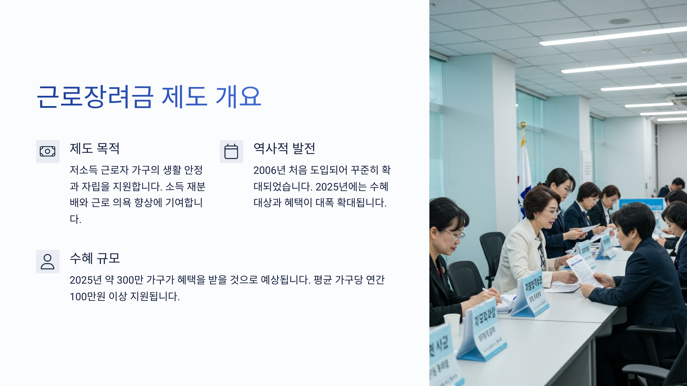 2009년 처음 시행된 이래로 지급 대상을 점차 확대하며, 현재는 근로자뿐 아니라 사업자, 종교인까지 포함하고 있어요. 이 제도는 세금 환급이 아닌 직접적인 현금 지원이라는 점에서 큰 매력을 가지고 있답니다.